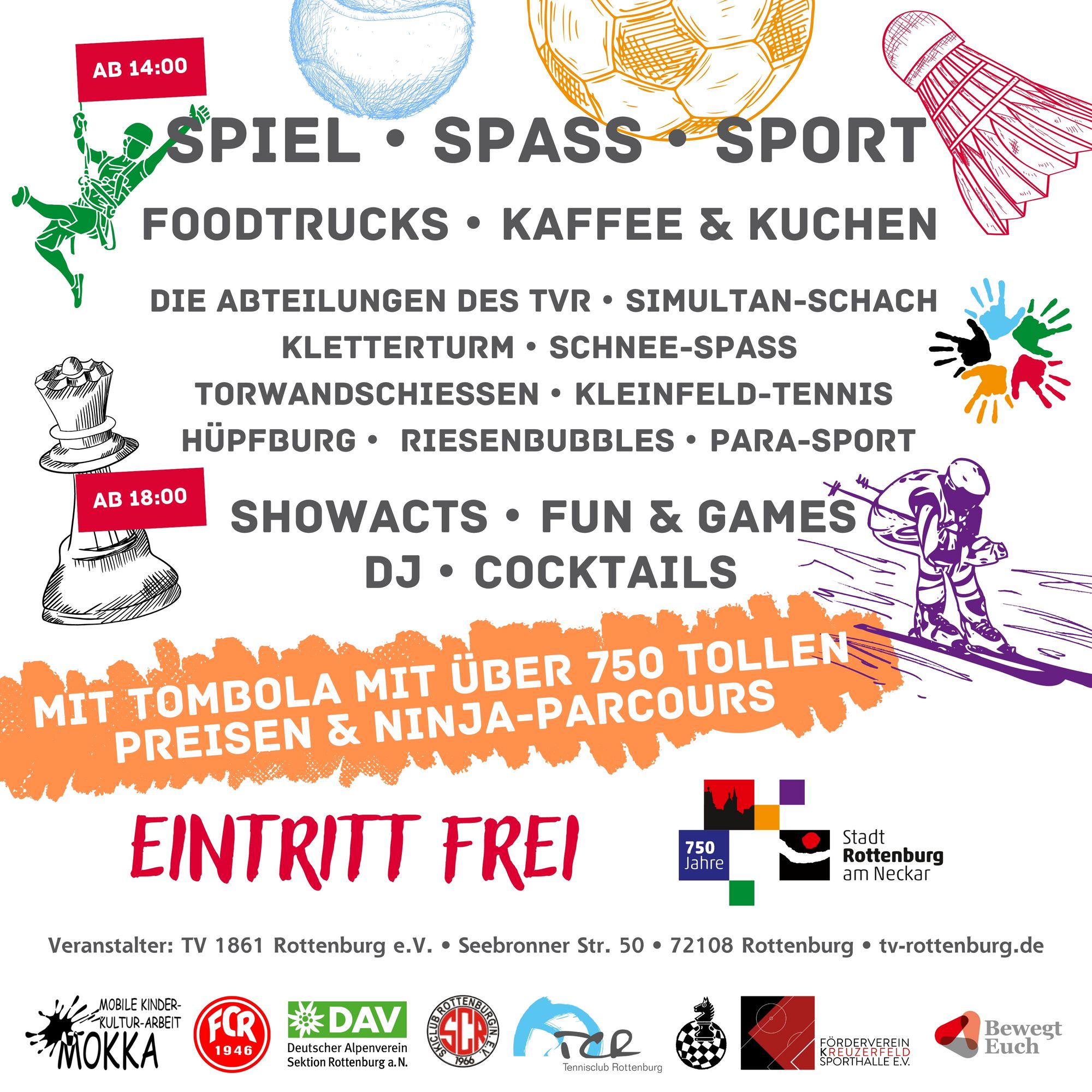 Gemeinsam mit der Stadt Rottenburg sowie den Partner-Vereinen, Fußball-Club Rottenburg 1946 e.V., MOKKA e.V., Skiclub Rottenburg 1966 e.V., Deutscher Alpenverein e.V. Sektion Rottenburg, Tennisclub Rottenburg e.V., BewegtEuch e.V., Schachfreunde Springer Rottenburg e.V. und Förderverein Kreuzerfeldsporthalle e.V. laden wir alle herzlich ein, Teil dieses besonderen sportlichen Events zu werden und gemeinsam Rottenburg zu bewegen.