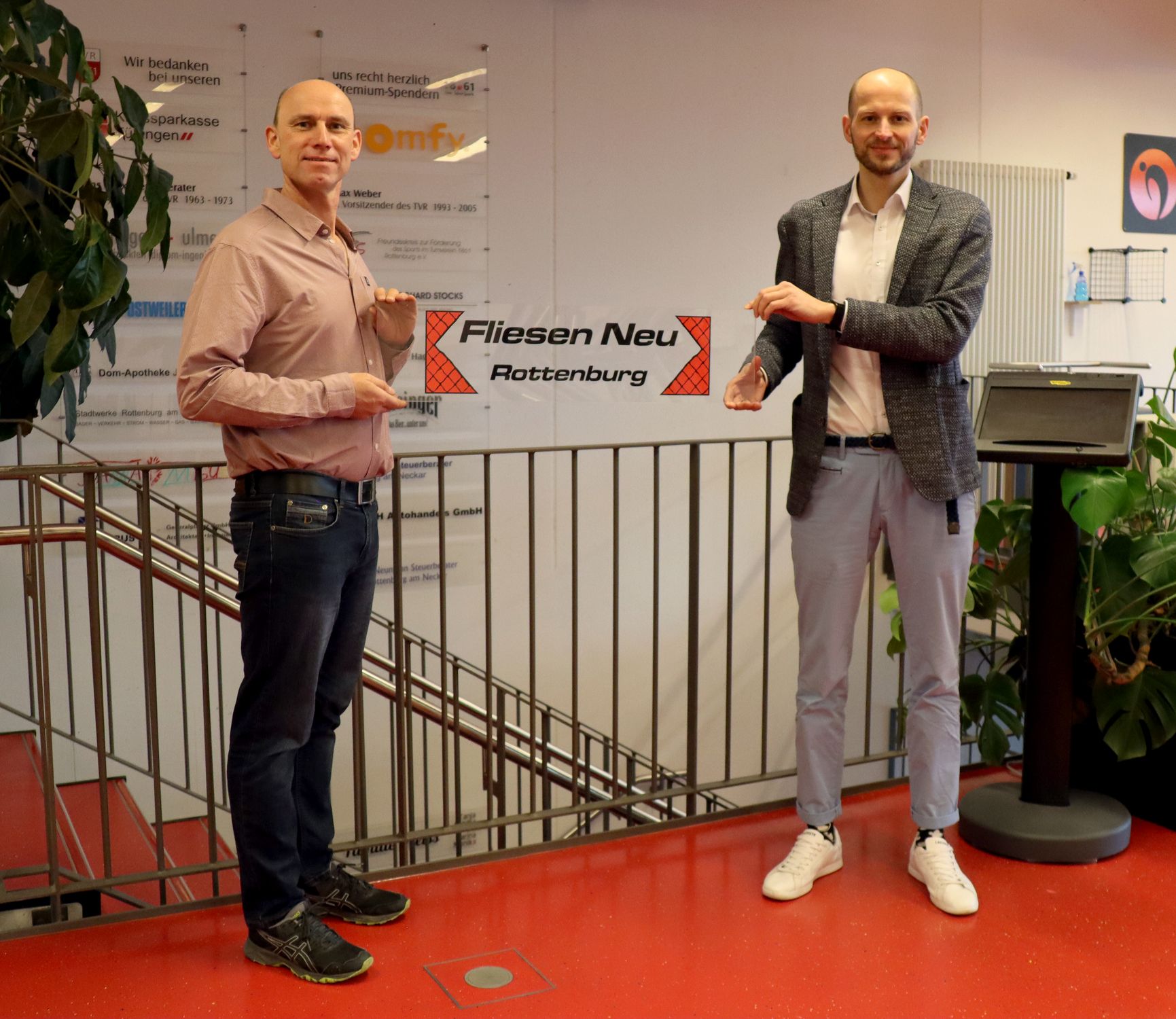 Bei der Übergabe der Spender-Tafel durch den stellvertretenden Geschäftsführer Philipp Vollmer war der Sportpark 18-61 pandemiebedingt verwaist. „Es wird Zeit, dass wir wieder Sport treiben dürfen“, sagte Markus Neu, den viele auch von der Feuerwehr oder der Narrenzunft kennen. „Er ist ein Vereinsmensch und weiß, welch wichtigen Beitrag die Vereine für die Gesellschaft leisten und wie wichtig Unterstützer für deren Arbeit sind“, sagte Philipp Vollmer und bedankte sich im Namen des ganzen Vorstands und des Turnvereins beim Fliesenlegermeister.