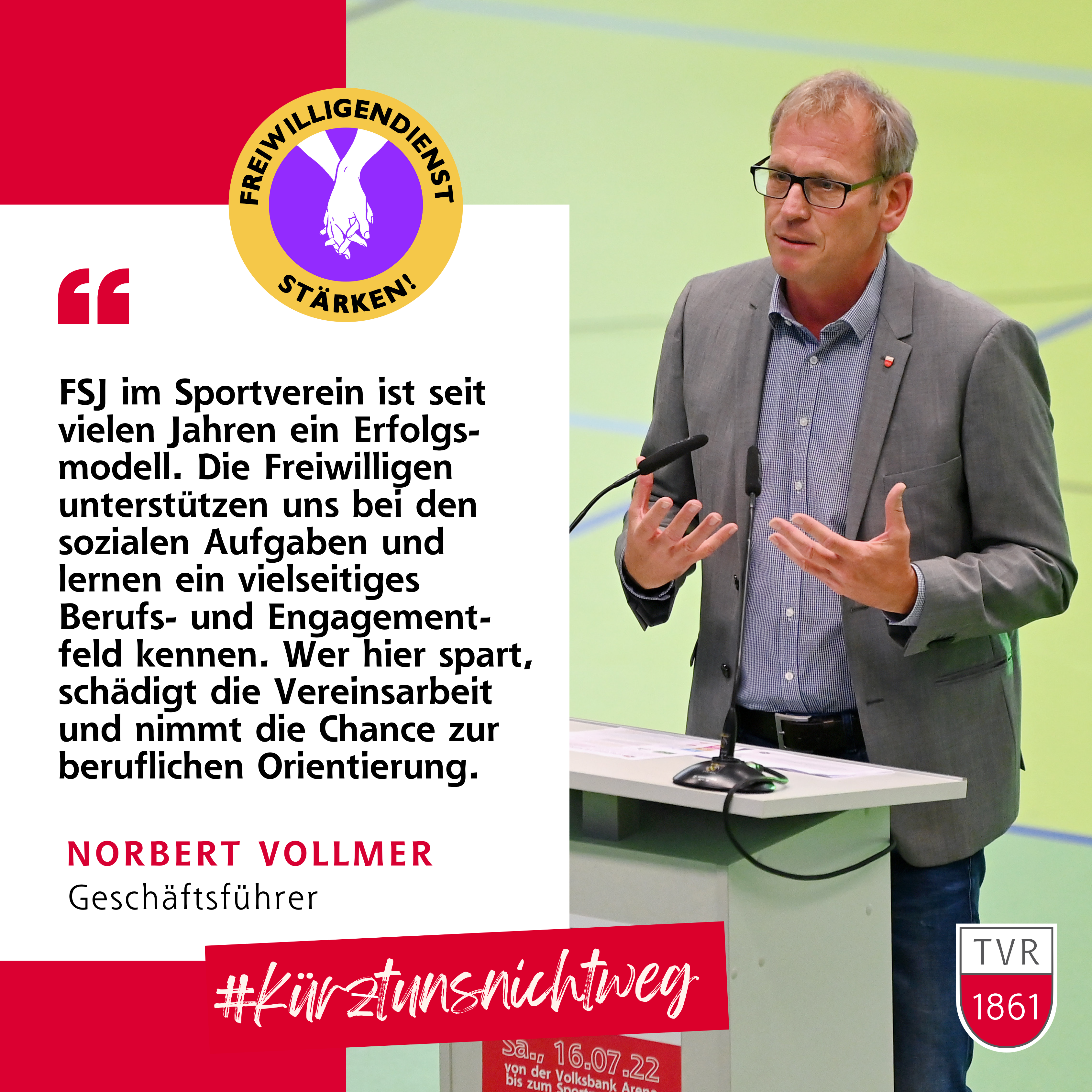 „FSJ im Sportverein ist seit vielen Jahren ein Erfolgsmodell. Die Freiwilligen unterstützen uns bei den sozialen Aufgaben und lernen ein vielseitiges Berufs- und Engagementfeld kennen. Wer hier spart, schädigt die Vereinsarbeit und nimmt die Chance zur beruflichen Orientierung.“