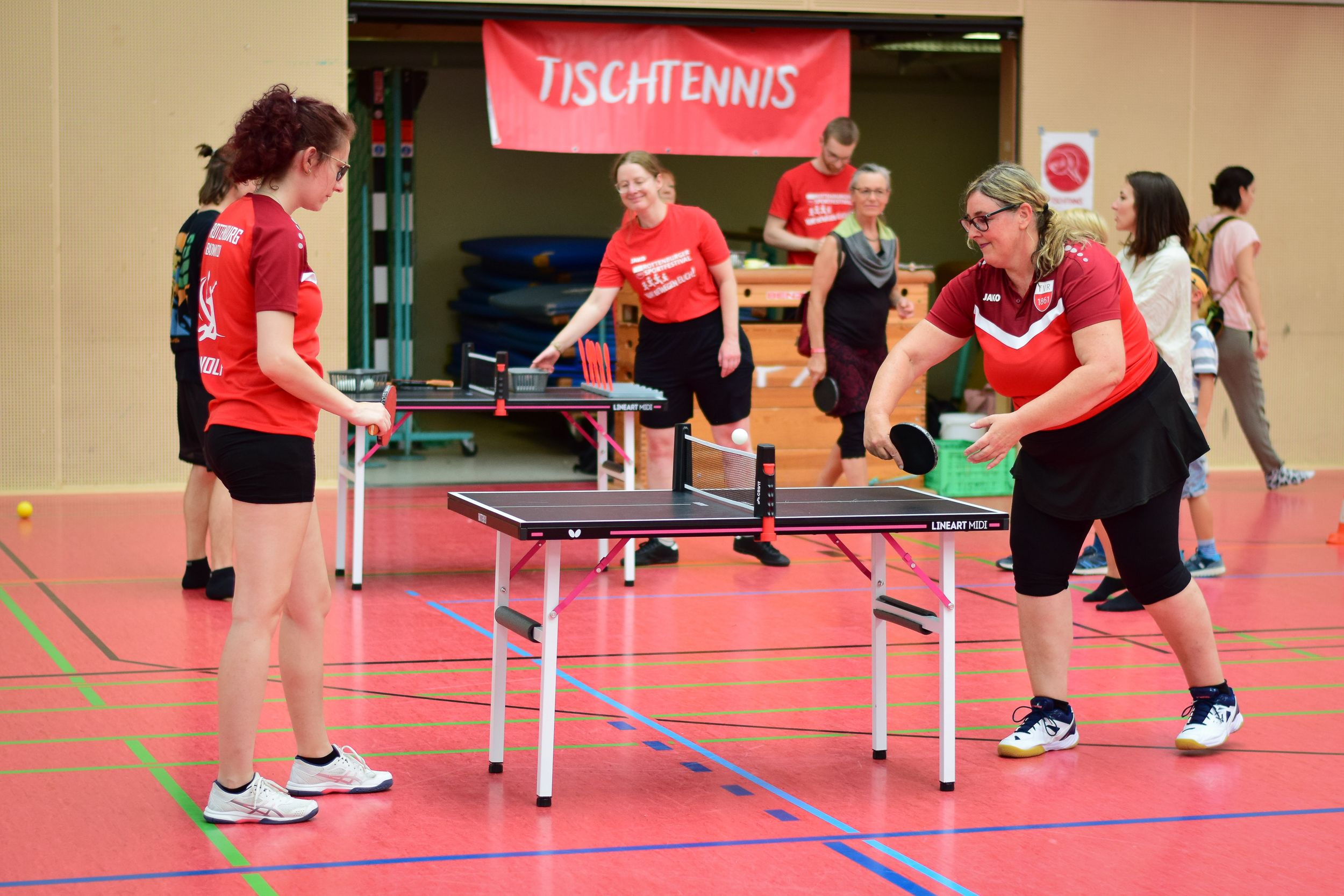 Viele Sportarten waren dabei mit kreativen Mitmachangeboten: Tischtennis, Badminton, Basketball, Leichtathletik, Triathlon, Handball, Volleyball, Turnen, Judo, Tennis, Schach und sogar Wintersport mit einer Biathlon-Station. Es wurde voller Freude geworfen, gesprungen, geklettert, gerannt und mit Schlägern geschwungen nach dem Motto: „Wir bewegen Euch!“