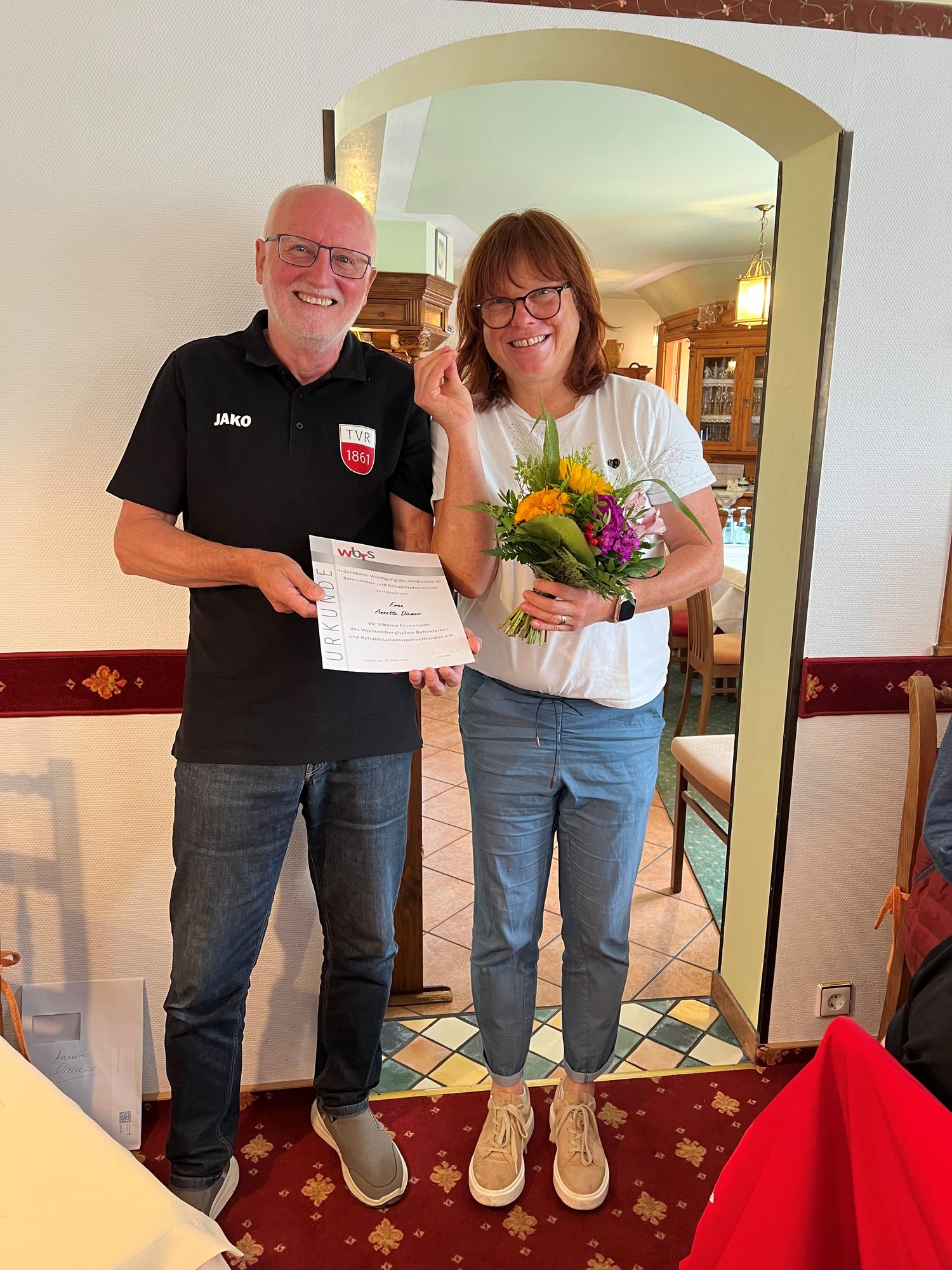 Am vergangenen Donnerstag wurde Annette Diemer im Rahmen des gemeinsamen Sommerabschlusses der Reha-Sport Gruppe Sport nach Schlaganfall für ihre langjährige und engagierte Arbeit im Reha-Sport mit der Silbernen Ehrennadel des WBRS (Württembergischer Behinderten -und Rehabilitationssportverband) ausgezeichnet. Vorstandsmitglied Günter Werz überreichte ihr die Ehrung und würdigte ihr Engagement.