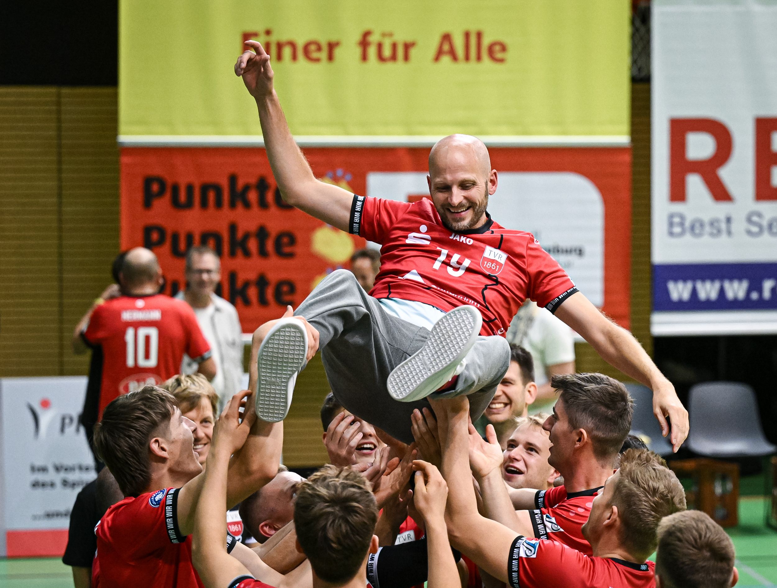 Der Volleyball-Manager und Sportpark-Chef hat sich den großen Abschied also wohl verdient. Er bekommt ihn schließlich wie die großen Spieler und Trainer des Bundesligisten: Mit wichtigen Verantwortlichen und Wegbegleitern, mit eigenem Hall-of-Fame-Trikot und Standing Ovations der TVR-Fans. Als Zugabe und besonderes Dankeschön wirft ihn das Team noch hoch in die Arena. Danke Philipp Vollmer!