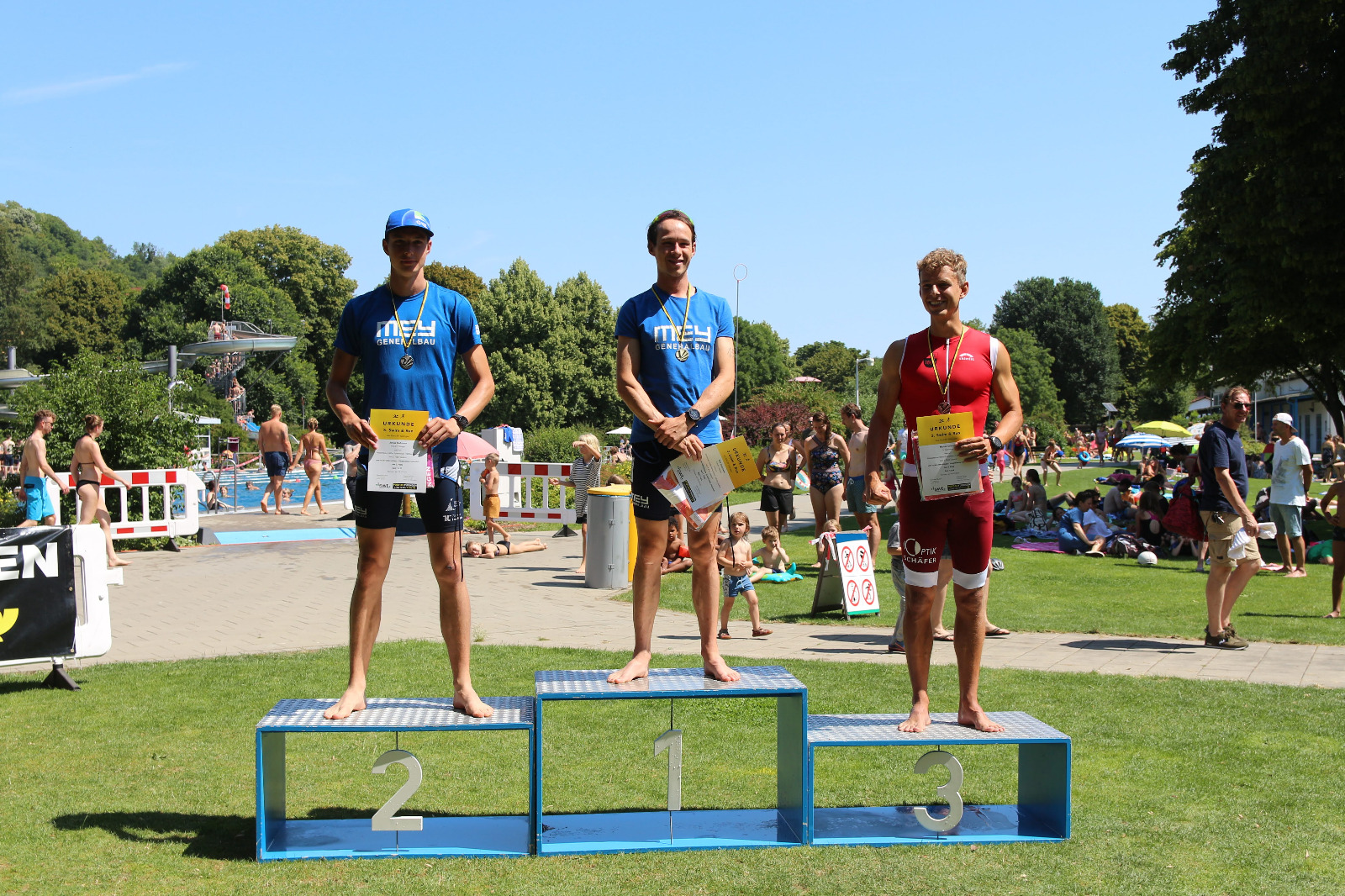 Marius, Sven und Mats gingen gemeinsam über die Mittelstrecke mit 300m Schwimmen und anschließenden 3000m laufen an den Start. Die beste Platzierung des Trios gelang Marius, der in einer Zeit von 15:54 Minuten den Sprung aufs Podest schaffte und den dritten Platz belegte. Damit musste er sich nur zwei Athleten des ausrichtenden Vereins Post-SV Tübingen geschlagen geben. Knapp zweieinhalb Minuten später kam Sven ins Ziel mit einer Zeit von 18:27 Minuten. Damit komplettierte er die Top10 des Tages. Mats folgte dicht danach mit einer Zeit von 18:44 Minuten und finishte auf einem starken 14. Platz.