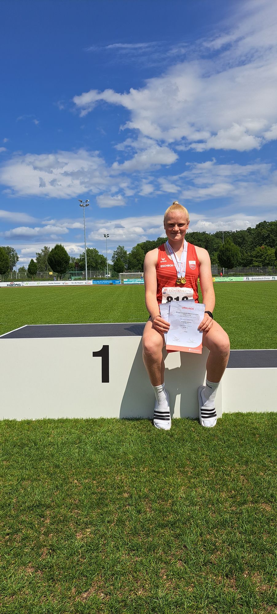 Der Sonntag startete für die Athletinnen des TV Rottenburg äußerst erfolgreich. Erst konnte Laura mit einer Saisonbestleitung von 2:39,82 nicht nur dicht an ihre Bestleistung heranlaufen, sondern in einem sehr schnellen Rennen auch einen starken 12. Platz erreichen. Fast zeitgleich konnte Anna in einem hochklassig besetzen Feld nach anfänglichen Schwierigkeiten bei ihrer Einstiegshöhe das Feld von hinten aufrollen. Jede weitere Höhe übersprang sie gleich im ersten Versuch und konnte sich mit 1,54m zur Württembergischen Meisterin küren. Mit dieser Leistung erhielt Anna auch eine Einladung zum U16 Sommercamp des Landesverbandes für die besten Athleten der Jahrgänge 2008/09. Der zweite Meistertitel folgte kurz danach durch Antonia. Mit neuer persönlicher Bestleistung von 37,82m konnte sie zum einen den Titel holen, sondern auch auf Platz vier in der deutschen Bestenliste vorrücken. Am Mittag gab es noch zwei weitere Podestplätze bei drei Starts. Erst konnte Anna im Mehrfachsprung, einer Vorstufe des Dreisprungs, mit 15,00m die Silbermedaille gewinnen. Bei steigenden Temperaturen startete Anne abschließend noch über die 80m Hürden bei der sie einen 10. Platz ersprinten konnte. Noch einmal Gold gab es für Antonia im Kugelstoßen. Hier konnte sie erneut eine persönliche Bestleistung stoßen und den Wettkampf mit 13,08m gewinnen. Zusammen mit der bereits letzte Woche ausgetragenen Hammerwurf Meisterschaft (Gold mit 42,37m) konnte Antonia bei vier Disziplinen drei Meistertitel und einen Vizetitel nach Rottenburg holen.