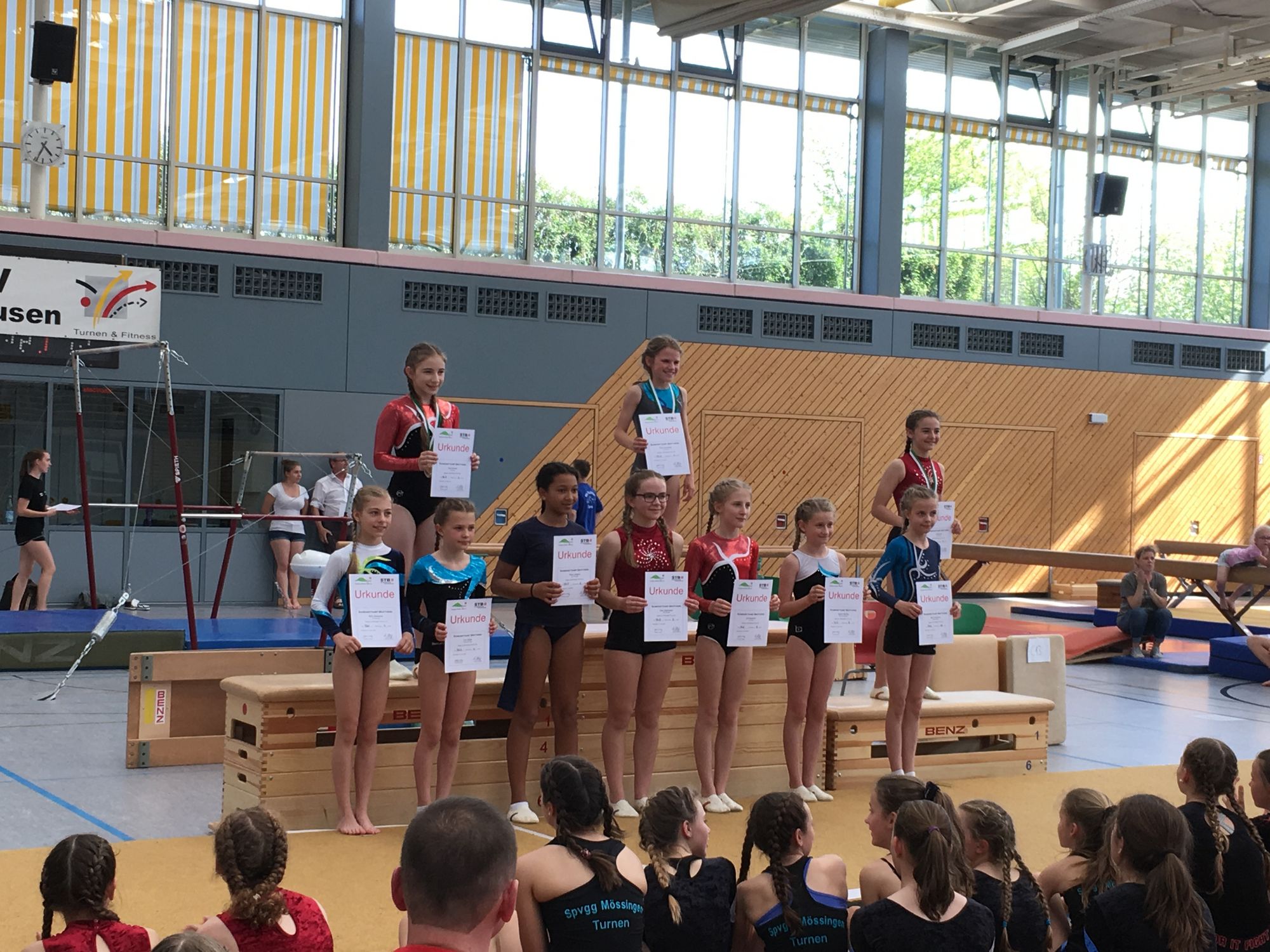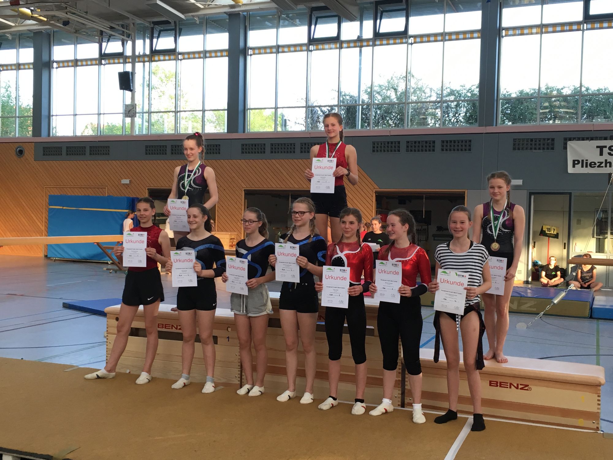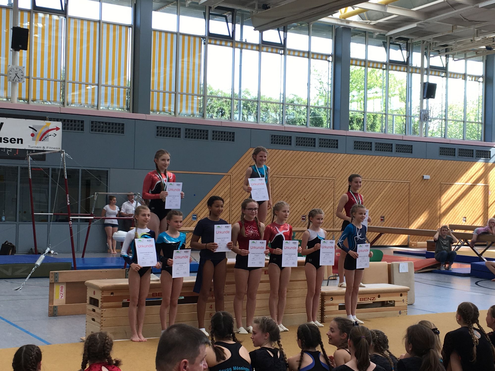 Bei der Siegerehrung durfte Aileen Gall mit 56,2 Punkten die Bronzemedaille in Emfang nehmen. Mit Jana Augsburger hatte man eine weitere Turnerin unter den ersten 10 Teilnehmerinnen (Platz 7 mit 54,9 Punkten). Pia Schlüssler gelangt mit 53,6 Punkten auf den 11. Platz, dicht gefolgt von Lisa Tyurin mit 53,3 Punkten auf Platz 12. Sophie Kammerer turnte sich mit 52,9 Punkten auf einen tollen 13. Platz. In dieser Jugend gingen insgesamt 26 Turnerinnen an den Start.